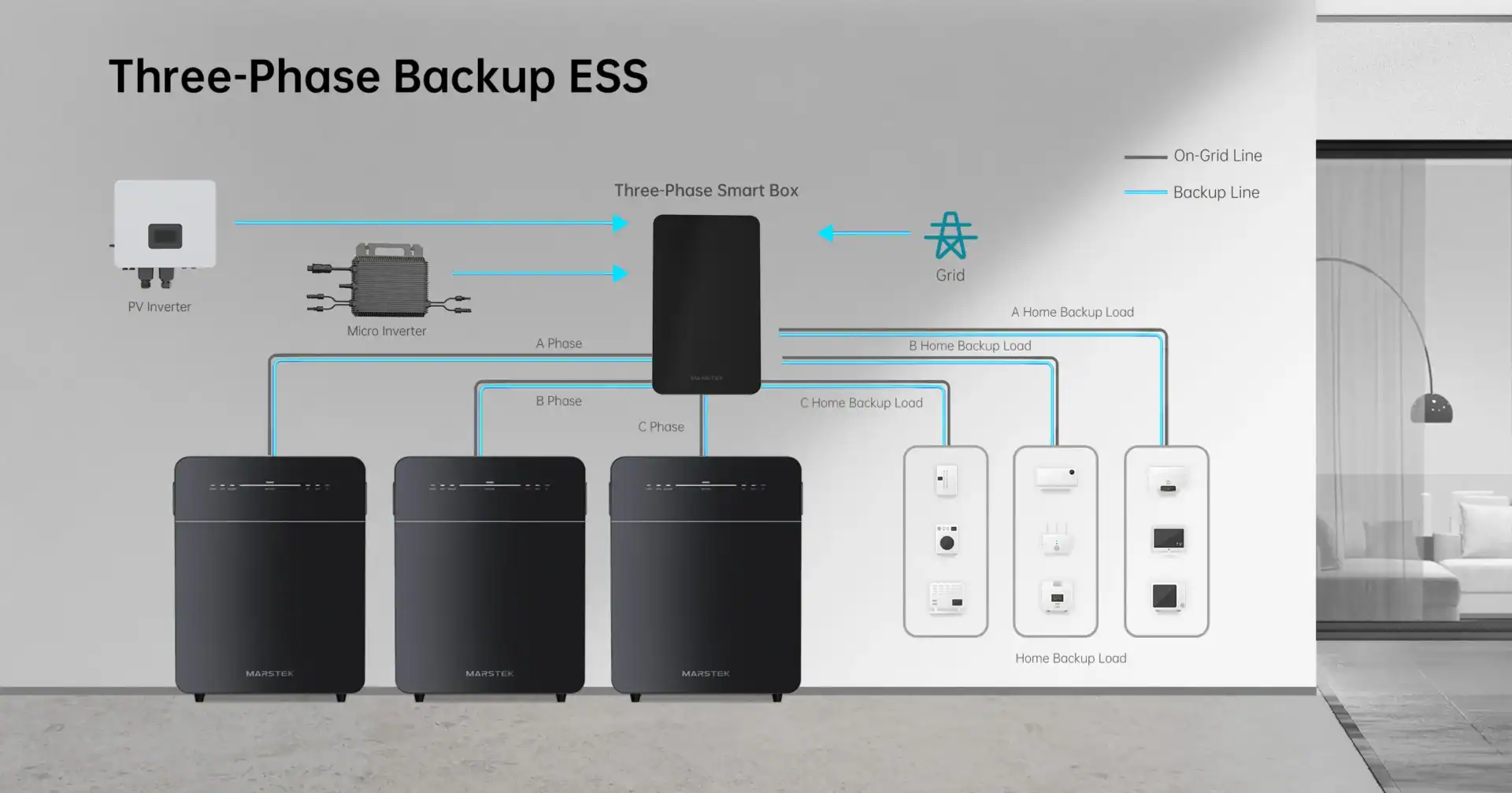 De Marstek Venus E 3.0 ondersteunt back-upstroom voor zowel enkelfase- als driefase-installaties met de Smart Back-Up Box. Of je nu één batterij gebruikt of meerdere parallel schakelt, je hele woning blijft voorzien van stroom bij een netstoring.